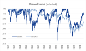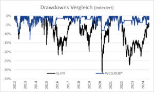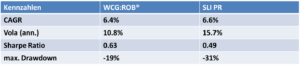 Im zweiten Schritt kann dieser Betrag vollständig investiert werden. Um nun von den langfristig höheren Aktienmarktrenditen profitieren zu können aber das Schwankungsrisiko zu begrenzen ist die konsequente regelbasierte Bewirtschaftung eines Aktienuniversums (im nachfolgenden Beispiel der Swiss Leader Index / SLI) zentral. Ein solch risikofokussierter Ansatz reduziert die negativen Schwankungen (Drawdown) und verbessert so das Risiko/Rendite-Verhältnis (Sharpe Ratio).